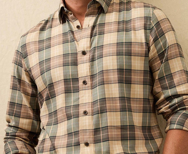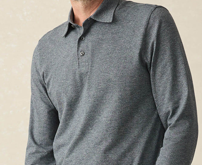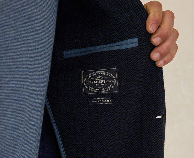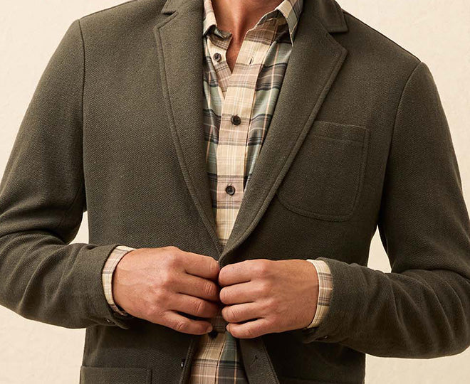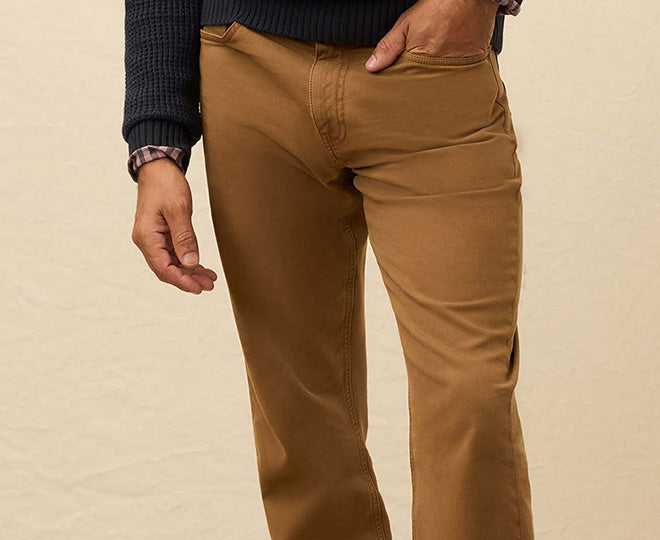 Man wearing a dark navy waffle sweater and beige pants against a beige backgroundMan wearing a dark navy waffle sweater and beige pants against a beige background
