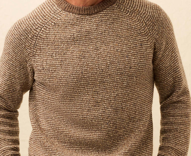Man is wearing a blue and white sweater against a beige backgroundMan is wearing a blue and white sweater against a beige background