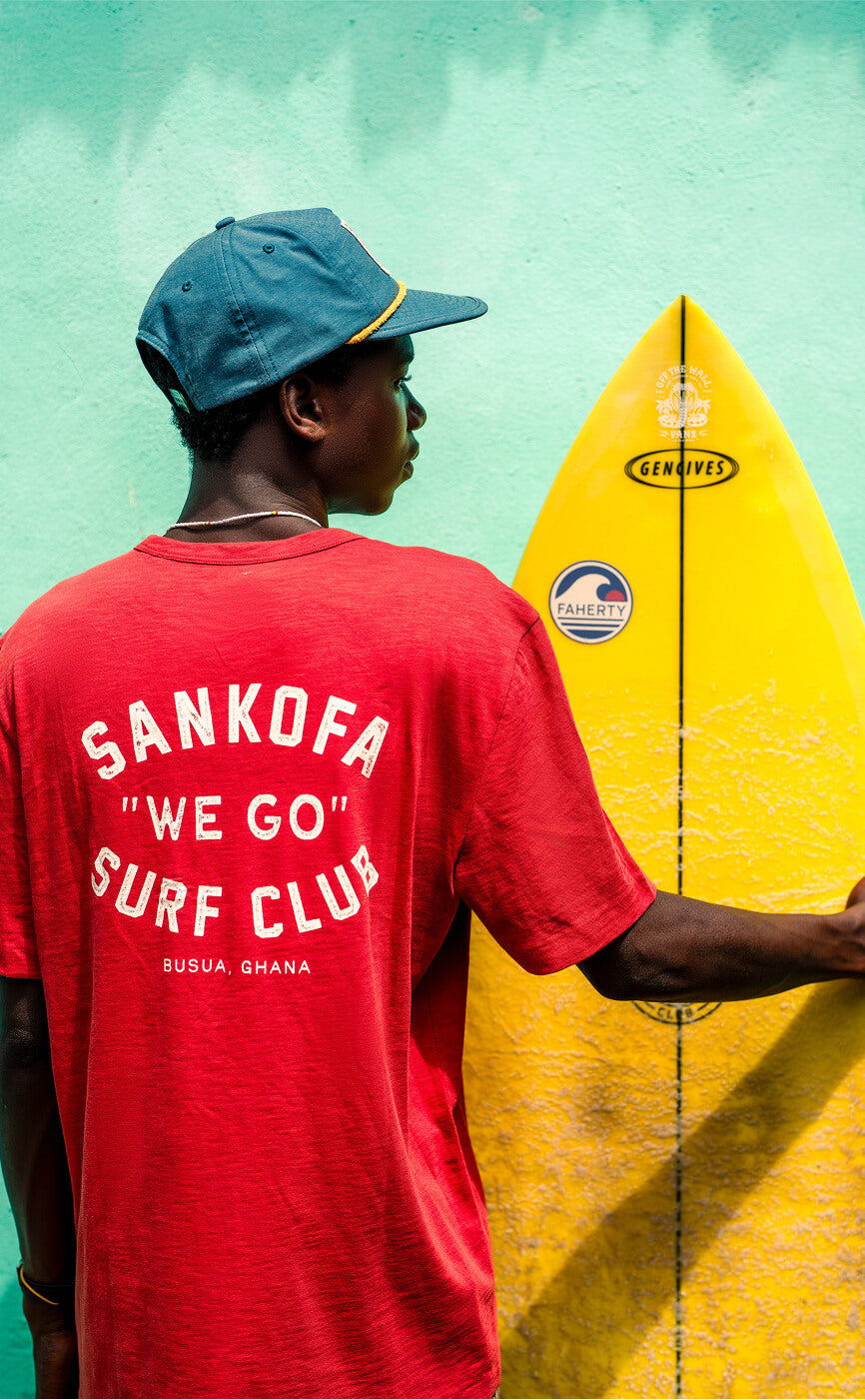This water gives you new life. Makes you whole. Reminds you that the present is where miracles occur. Much like the one that led to my return to Ghana. I had no intention of moving back to Los Angeles. I loved Ghana. I had moved there at the end of 2019 because I wanted a break from America. At the time, I didn’t know anyone from the country, but found my people along the way. One of them was Sandy Alibo, founder of Surf Ghana, a surf and skate collective in the fishing village of Busua. Last year, on the set of Faherty’s spring 2024 campaign shoot, Mike Faherty overheard me talking about Ghana’s incredible surf community. He said it was his dream to do a shoot there. That dream was realized, along with the story behind Surf Ghana’s mission.