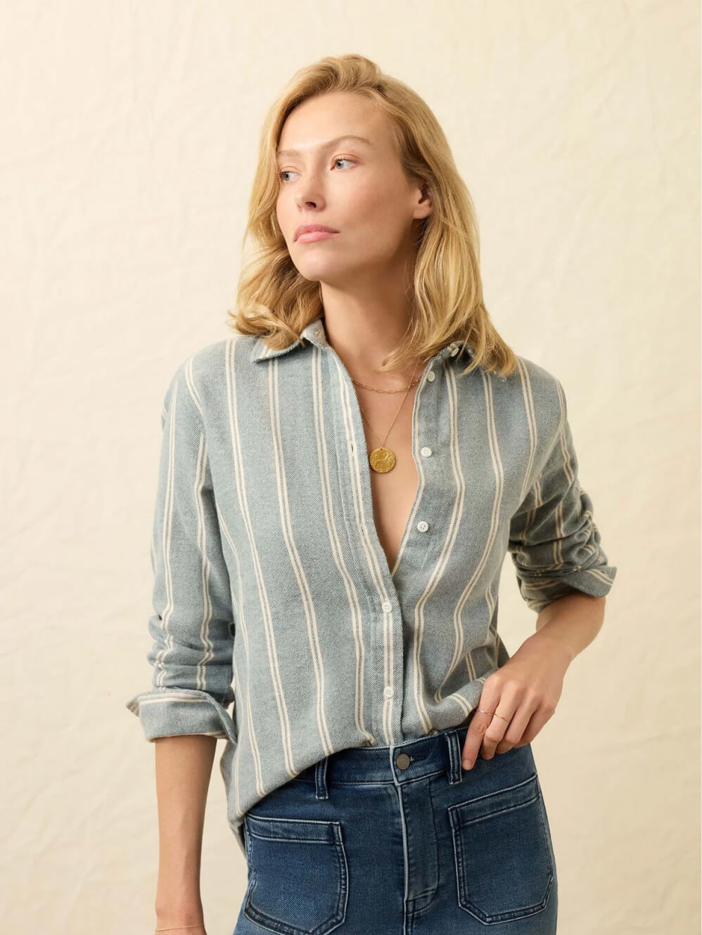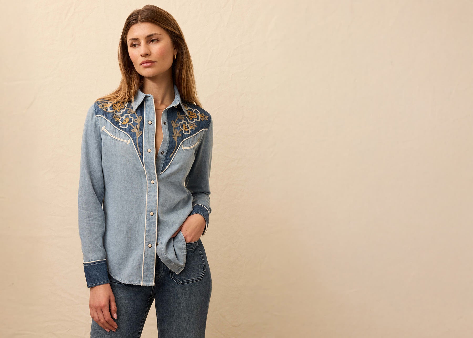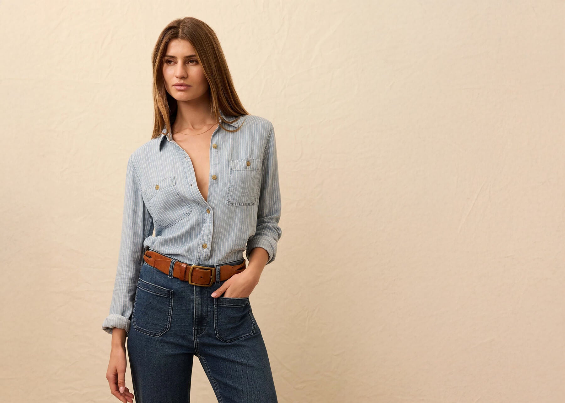 Denim shirts are wardrobe workhorses for a reason—they layer, they last, and they look better with age. This one's crafted from quality cotton denim that's soft enough to wear comfortably but structured enough to hold its shape. Whether you're buttoning it up or wearing it open as a layer, it adds that effortless, lived-in look that works with everything.